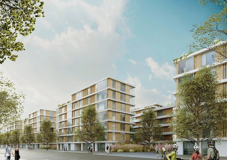An die Stadt hervorragend angebunden liegt das Grundstück traumhaft am Naturraum von Albertussee und Altem Heerdter Friedhof. Hier wird die von der Stadt propagierte und gerühmte Qualität Düsseldorfs mit der „Nähe von Wohnen, Arbeiten und Erholen“ und einer „verkehrstechnisch perfekten Vernetzung“ Wirklichkeit. Der Naturraum ist das kostbarste Gut einer Stadt. Als unverzichtbare Lebensgrundlage haben Grünflächen einen hohen Stellenwert für die Gesundheit und das menschliche Wohlbefinden. Eine notwendige Nachverdichtung von Innenstädten muss einhergehen mit dem Anspruch, qualitätsvolle Grün- und Freiräume für ihre Bewohner zu gewährleisten. Unter mikroklimatischen Aspekten dienen diese Räume als Frischluftreservoir und wirken der zunehmenden sommerlichen Überhitzung entgegen. Zudem sind sie wertvolle Versickerungsflächen. Die Wohnbebauung ist eingebettet in eine grüne Oase, in der die Grenzen und Übergänge fließend sind. Die Baukörper wachsen aus der Natur heraus. Alle Baukörper orientieren sich zum Inneren des Geländes und zum Wasser. Die Grundrisse sind so organisiert, dass die Qualitäten des Freiraums für alle Nutzer erlebbar werden. Die Lebens- und Wohnqualität an diesem Ort ist für alle Bewohner, insbesondere für die Kinder der Kindertagesstätten sehr hoch. Konsequenterweise spielen die Fassaden mit dem Thema des expressiven und fließenden Naturraums. Die vertikale Schichtung der Flächen und umlaufenden Brüstungen erzeugt ein lebhaftes, dynamisches Bild. Der grüne Raum erstreckt sich über Loggien und Balkone bis auf die Dächer. Glas und Holz sind die charakteristischen Materialien der Fassaden und kontrastieren spannungsreich mit den auskragenden Betonplatten und -brüstungen. Holz ist hier mehr als eine natürliche Oberflächenschicht. Es wird bewusst konstruktiv für die geschlossenen Elemente der Fassade und als Holzlamellenstruktur für Bereiche mit Lichtschutzbedarf eingesetzt. Dabei kommen die wirtschaftlichen Vorteile des modularen Holzbaus zum Tragen: eine erhebliche Verkürzung der Bauzeit durch Vorfertigung der Elemente im Werk und ein direkter Einbau auf der Baustelle. Darüber hinaus rückt Holz als natürlicher Baustoff derzeit wieder verstärkt in den Fokus, auch bei institutionellen Bauherrn. Erste Holzhochhäuser zeigen die erfolgreiche Renaissance des Baustoffs und die Ergebnisse gesetzlicher Weiterentwicklungen auf diesem Gebiet, die dem Holzbau zu neuer Attraktivität verhelfen. Nach wie vor besticht Holz durch seine nachhaltigen Charakteristika: ressourceneffizient und langlebig mit hervorragenden Wärmedämm- und raumklimatischen Eigenschaften.