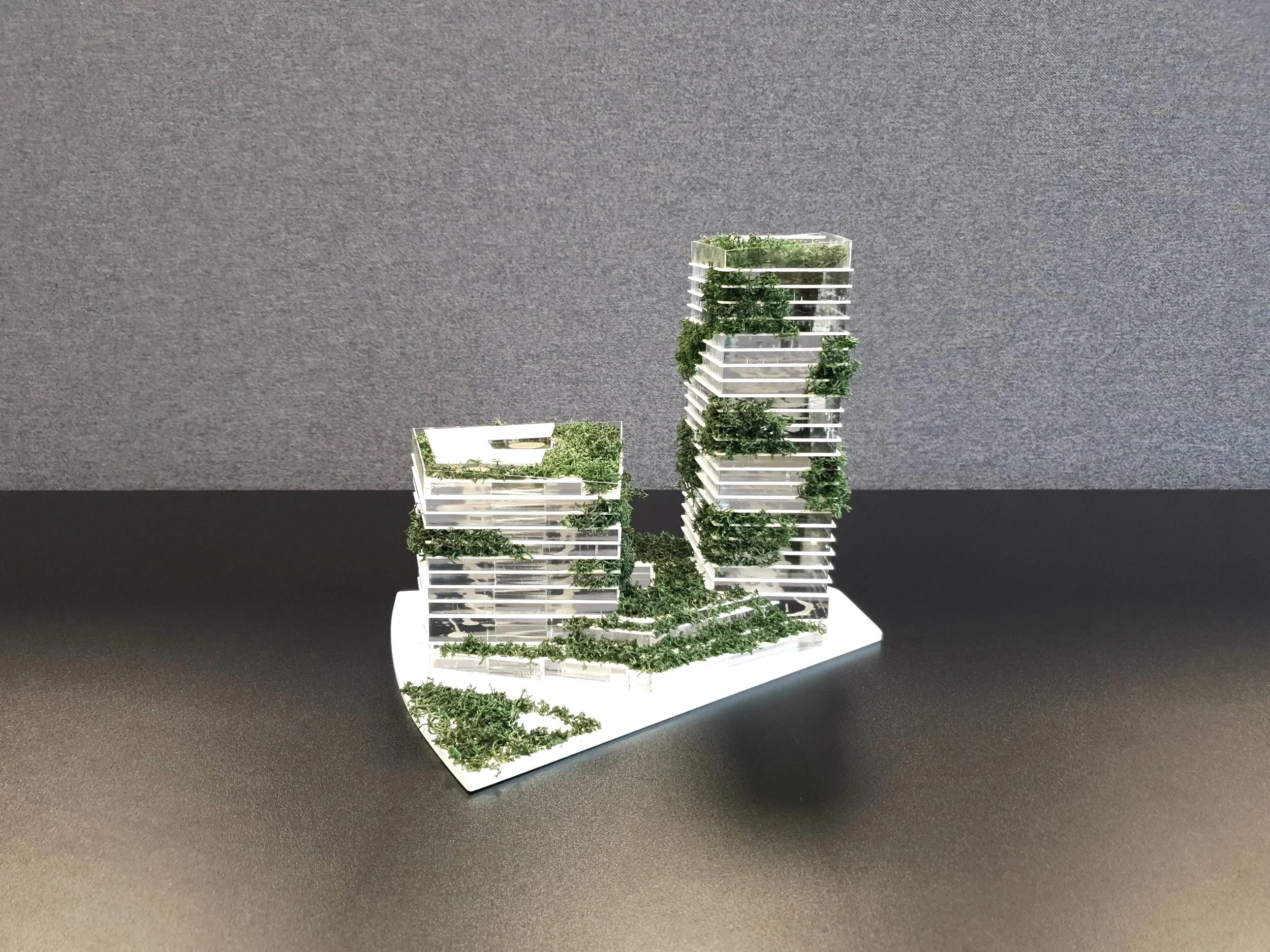 Die NRW.BANK zeigt sich als prismenartiges Ensemble mit markanten, sich abwechselnden Einschnitten, die die Landschaft vom Sockel durch eine intensive Begrünung über das gesamte Gebäude ziehen. Ausgangspunkt ist der differenzierte Sockel, der sich zur Haroldbucht in Kaskaden abtreppt und damit Landschaft und Gebäude miteinander verwebt. Die aufgehenden Körper nehmen dieses Thema auf. Großformatige, geschossweise alternierende unterschiedliche Einschnitte bieten nicht nur Platz für die intensive Begrünung des Gebäudes, sondern auch für Gemeinschaftsterrassen. An diesen Stellen befinden sich auch die sogenannten „Dörfer“ – informelle Treffpunkte für die Mitarbeiter mit großartigen Ausblicken.